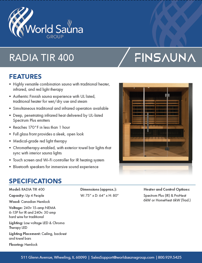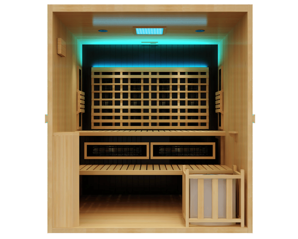 | Unique Features: | Hybrid heating system: Full infrared therapy + traditional steam functionality Comfortably seats up to 4 adults Built-in Bluetooth audio system Digital control panel for temperature and session management Premium Canadian Hemlock wood construction Designed for indoor residential use Creates a versatile wellness experience with customizable heat options |
